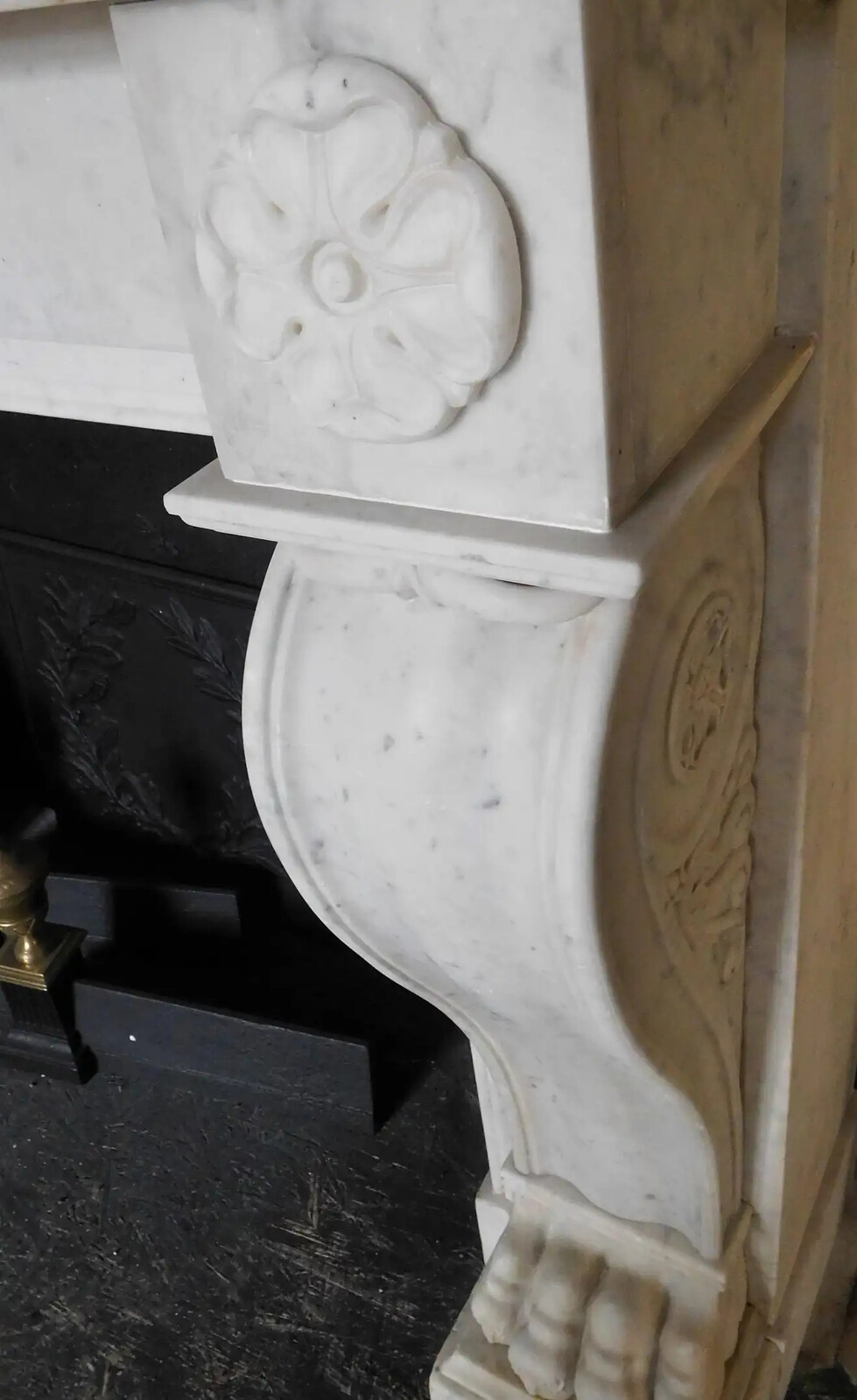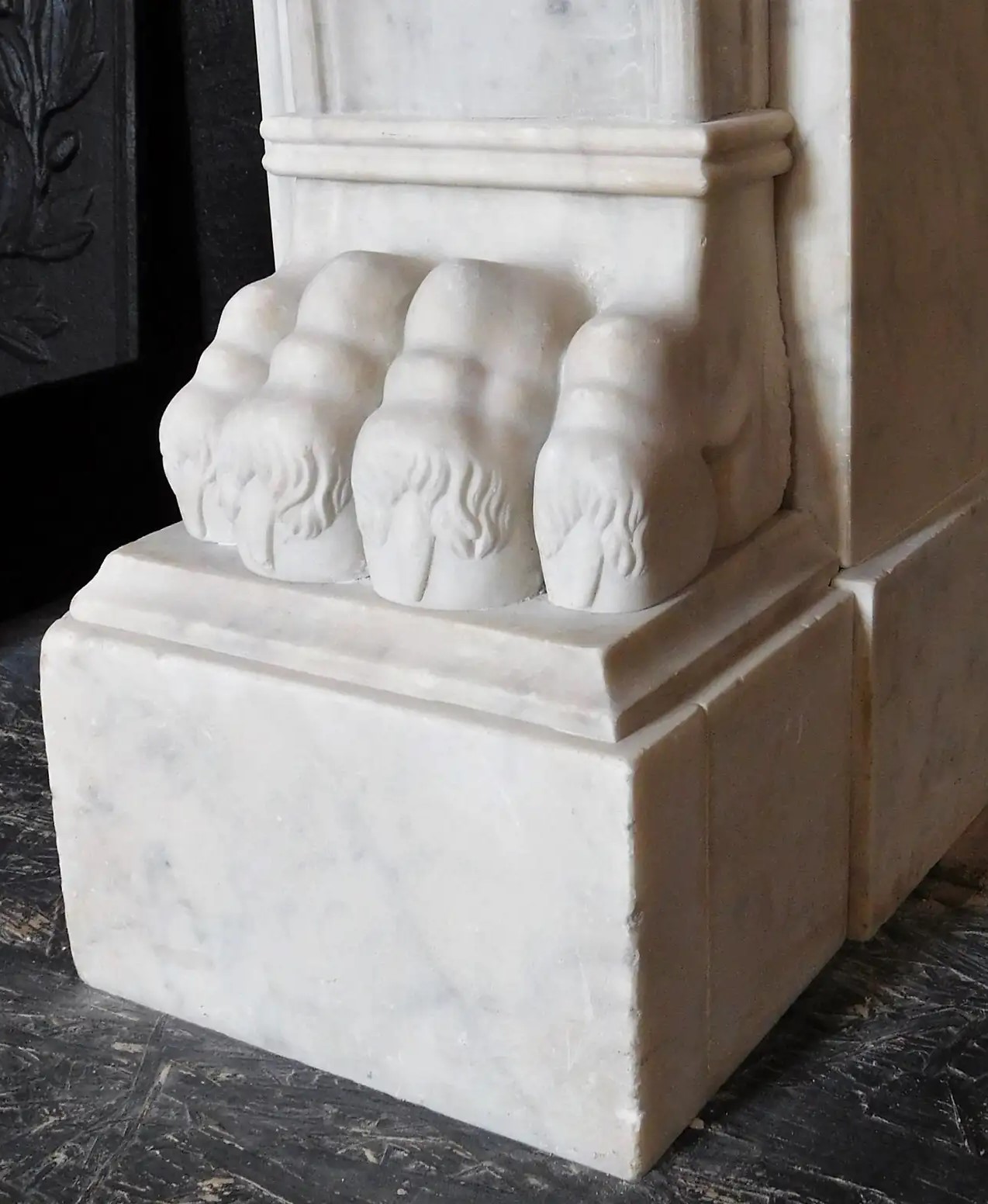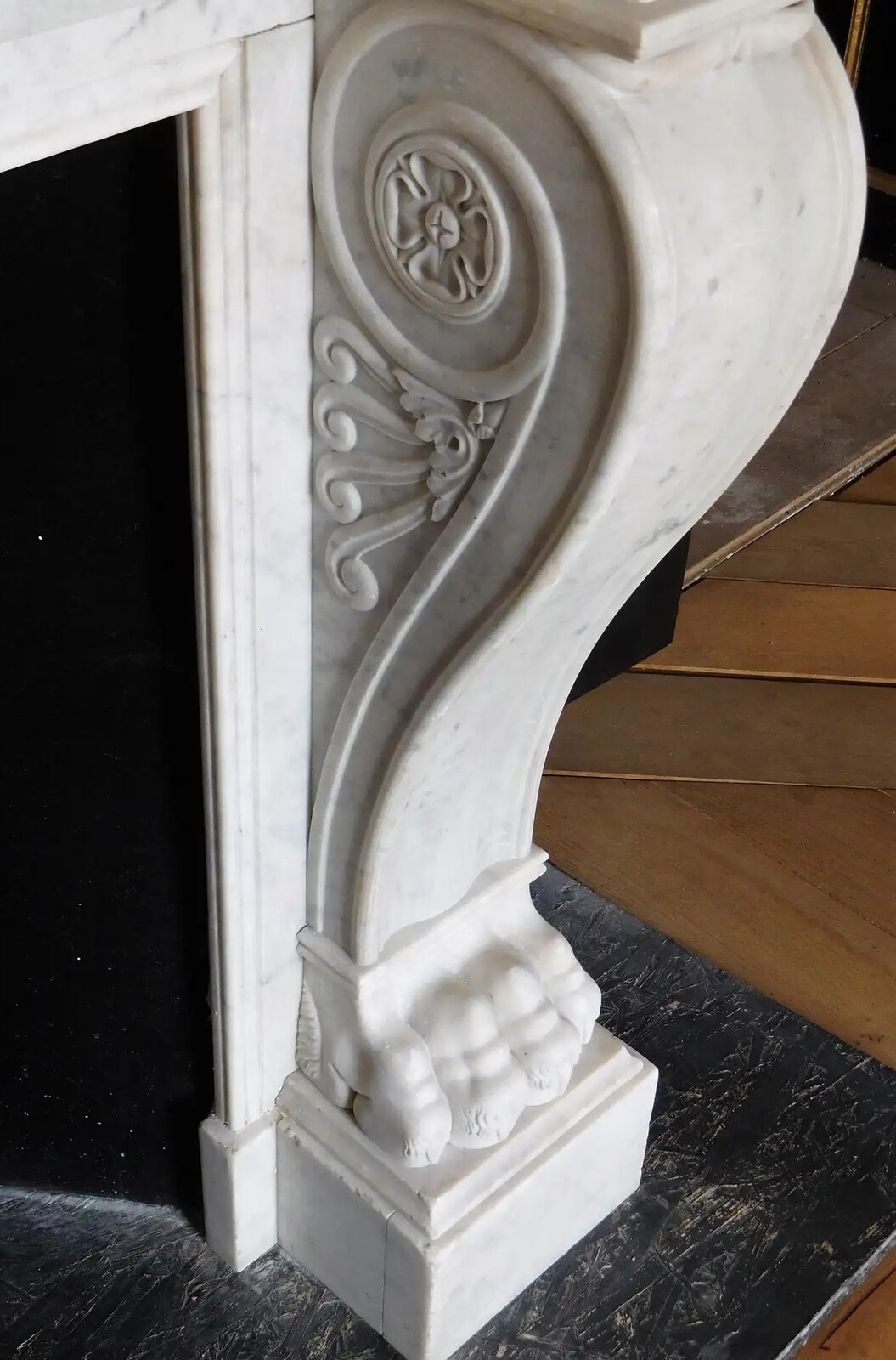 An imposing, striking Empire II chimneypiece, named Pattes de Lion or Lions Paws. Nicely carved in subdued Carrara marble. This marble has a Statuary quality (no bleu or grey in it), which adds a distinct shine and warm raffinée. Fireplace was found in an important Maison Maître in Brussels. Comparing the execution of this Lions Paws fireplace to other ones: All the sculpture works on this fireplace are above average. Inclusiv an original bronze/ormolu, to mount to the frieze-center, if you like. Will be delivered with old Carrara- or Noir de Mazy frontfloor-tiles. We have also foyertiles-refractaire- in stock. Worldwide shipping. Delivery in Europe can be done by Antique Fireplaces First: 'In House Delivery'.