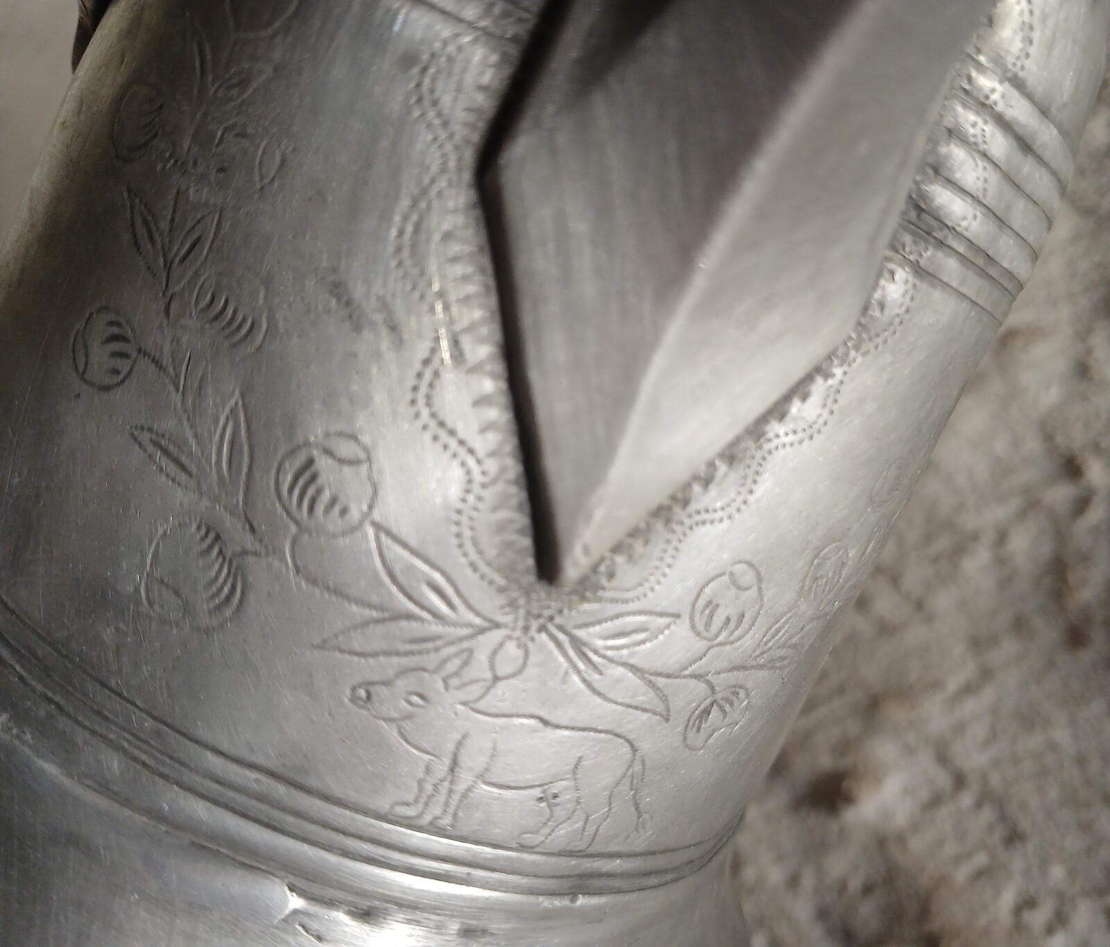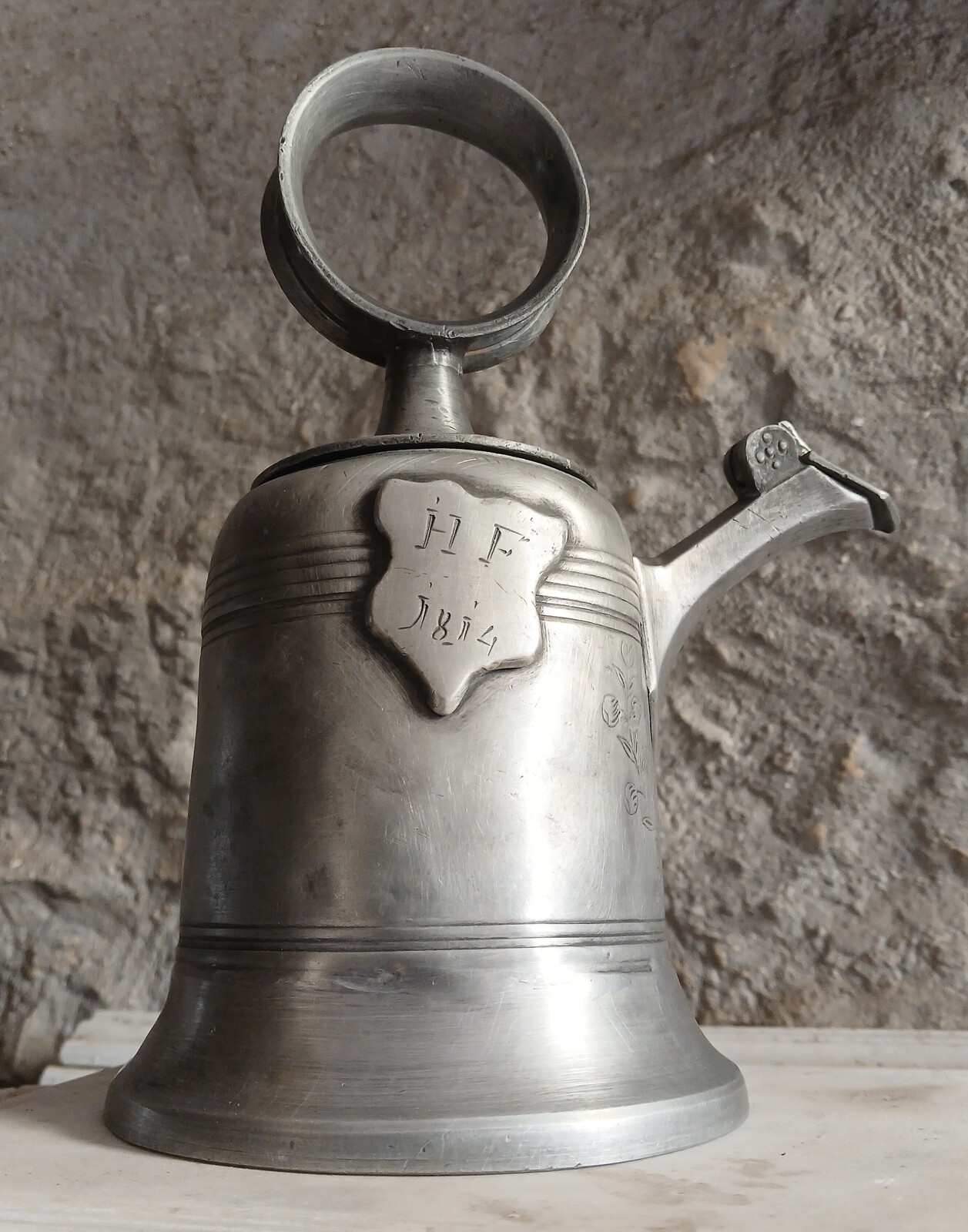 Pewter "Prismenkanne" wine-bottle "Chur" (Switzerland) 1792 with decor inscriptions. Round shaped with a screw cap topped with a large ring, fitted with a tubular spout, depicting a mark and 1792, with hinged close flap. A shield bears engraved initials of ownership and dated 1814. Nicely aged by time and use. Worldwide delivery.